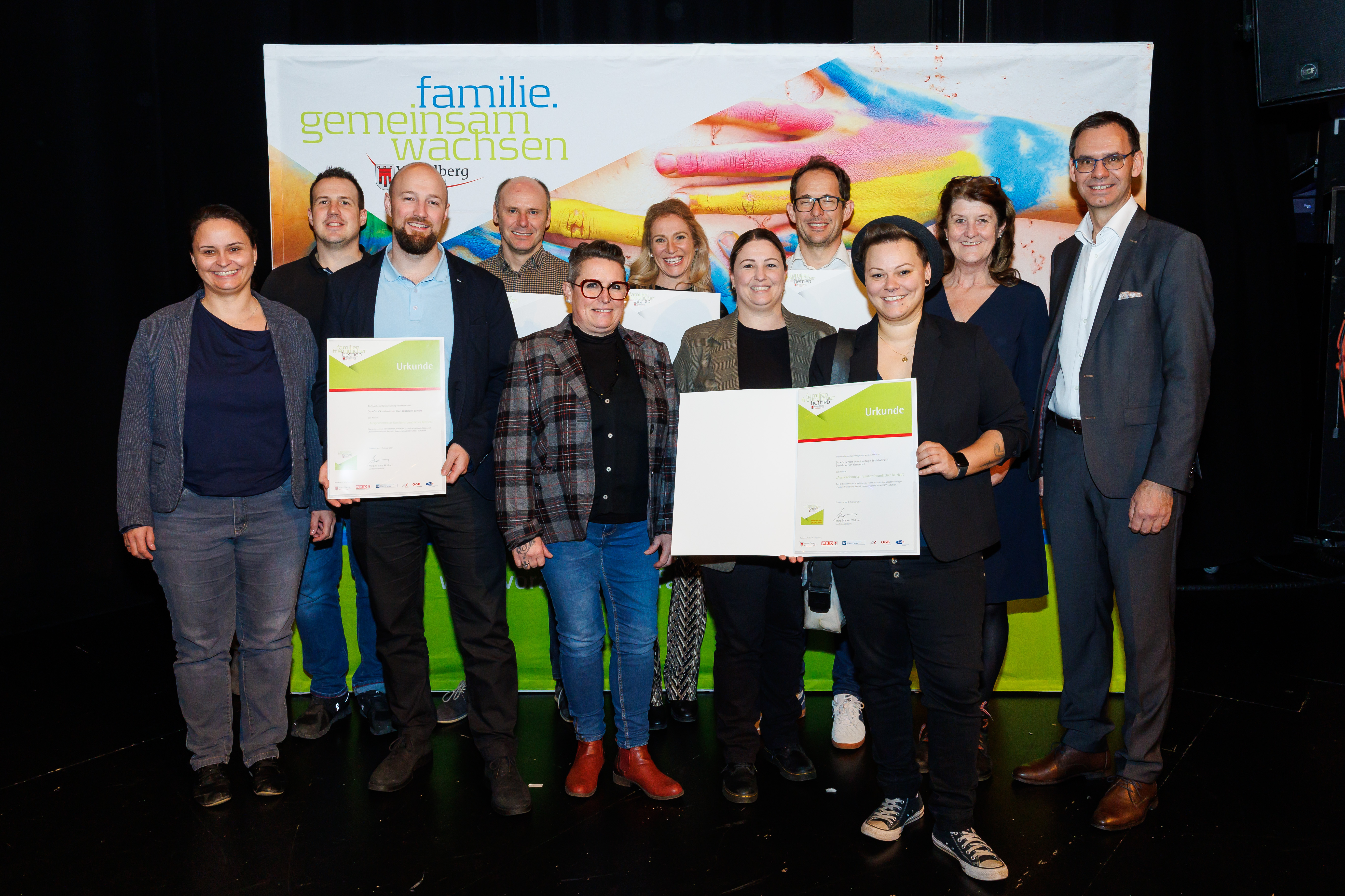 Seit über 20 Jahren wird das Gütesiegel „Ausgezeichneter familienfreundlicher Betrieb“, jeweils für zwei Jahre verliehen. Die SeneCura Häuser dürfen sich regelmäßig über die begehrte Auszeichnung freuen. Um das Gütesiegel zu erhalten, wird die Umsetzung von acht strengen Kriterien – darunter unter anderem flexible Arbeitszeitmodelle, Eltern- und Frauenförderung, Karenz und Wiedereinstieg oder auch das Weiterbildungsangebot – durch eine unabhängige Jury überprüft. Der Vorarlberger Landeshauptmann Markus Wallner überreichte die Auszeichnung auch heuer wieder persönlich an die zertifizierten Häuser in feierlichem Rahmen im Montaforthaus in Feldkirch. Er gratulierte der gesamten SeneCura Gruppe für ihr Engagement und ihre Leistungen.