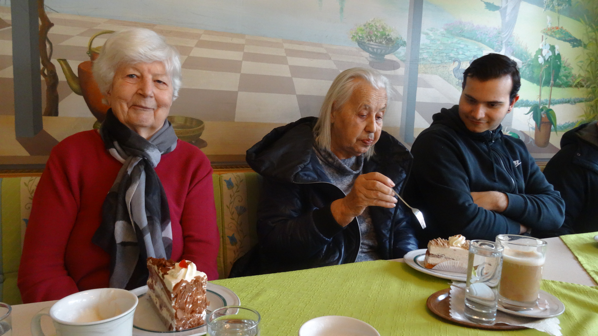 Bewohnerinnen Sieglinde Nesensohn und Gertraud Schwendinger mit Zivildieser Mert im Café Lorenz .