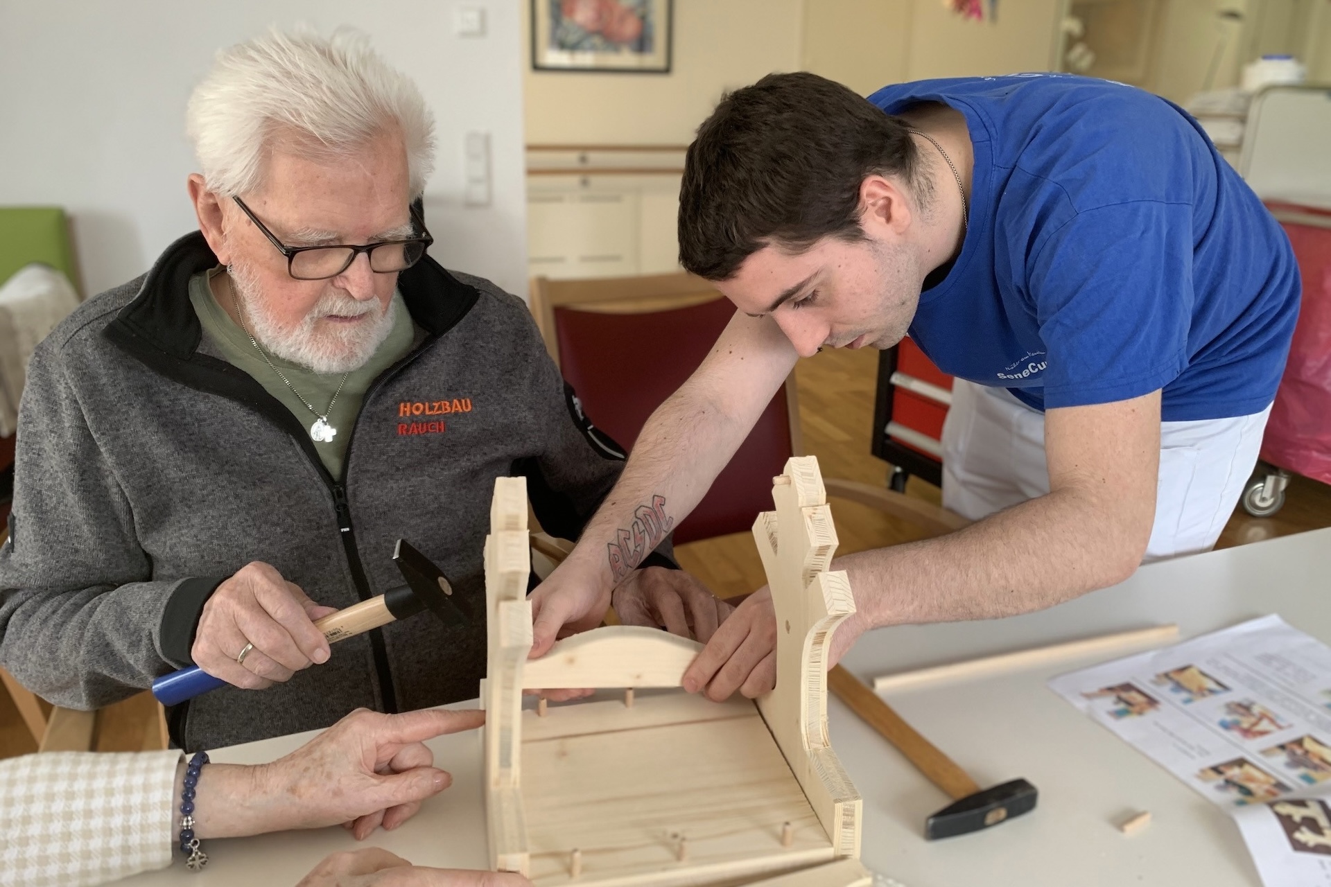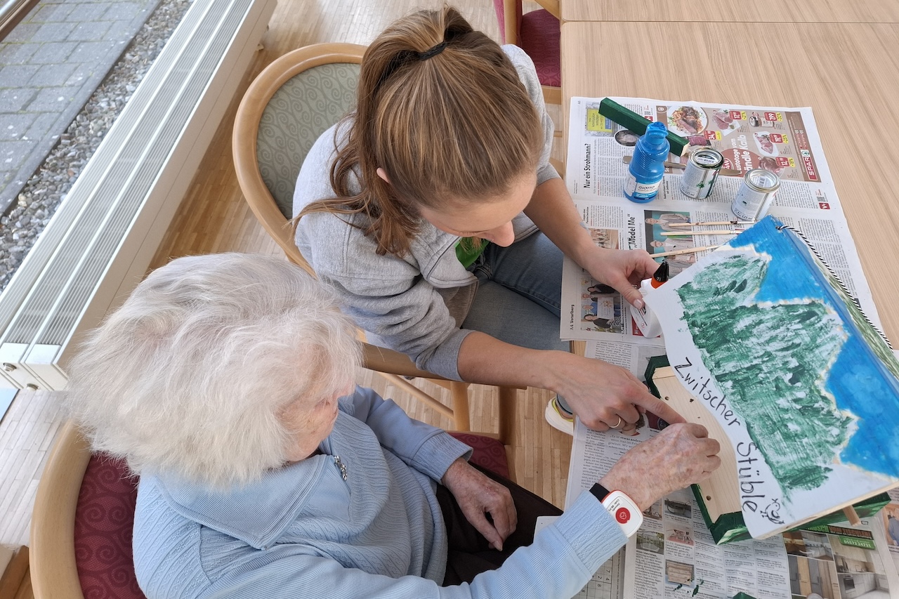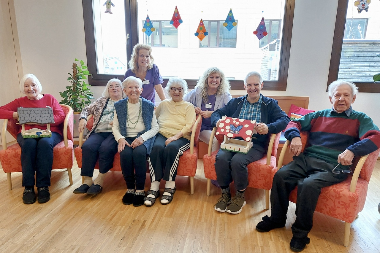 Der zweite Platz ging an das SeneCura Sozialzentrum Laurentius-Park Bludenz. Unter dem Titel „Zwitscher Stüble“ entstand ein liebevoll gestaltetes Vogelhaus, das die alpine Umgebung rund um Bludenz widerspiegelt. Beim Schleifen der Holzbauteile kamen die Bewohner Franz Malin, Günther Lindenbauer und Emil Wassle ordentlich ins Schwitzen, bevor die kreative Damenrunde mit den Bewohnerinnen Rosa Sahler, Anneliese Grafl und Maria Pichler zum Pinsel griff. Auf dem Dach sind nun die Berge zu sehen – mit etwas Glück erkennt man sogar den Muttersberg. Bäume an den Seiten symbolisieren Schutz und Geborgenheit.