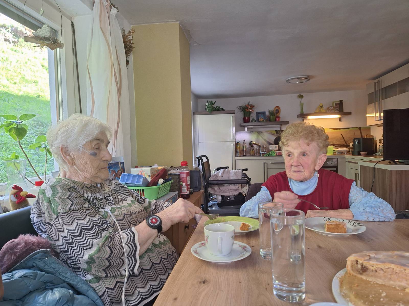 Ein herzliches Wiedersehen folgte beim Besuch ihrer Cousine Maria Schedler, die am Beginn der Wanderstrecke zum Quelltuff wohnt – ganz in der Nähe des Hauses, in dem Frau Gappmeier einst lebte und ihre Kinder großzog. Bei selbstgemachtem Apfelkuchen und Kaffee wurde gelacht, erzählt und in Erinnerungen geschwelgt.