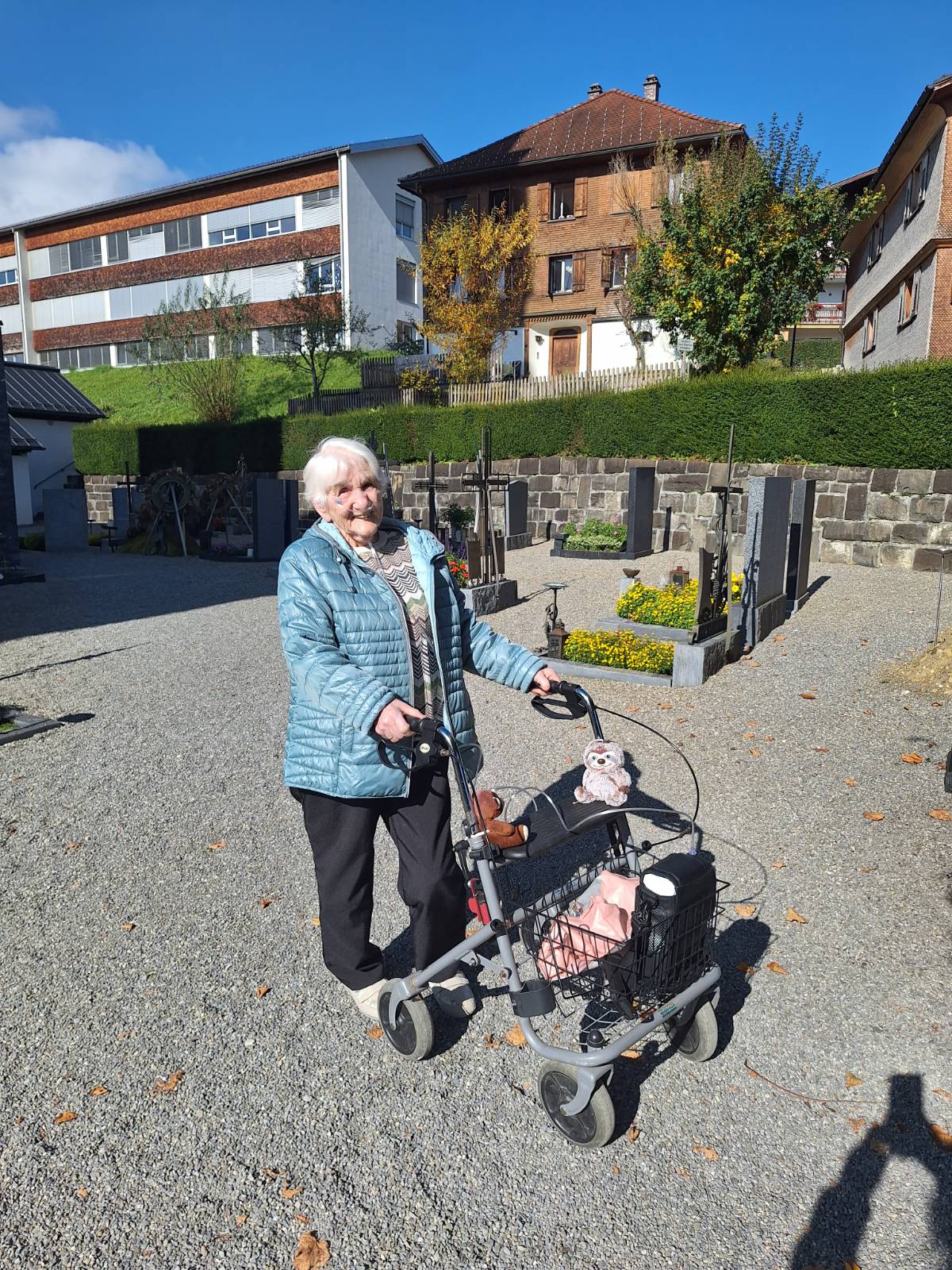 Bei strahlendem Sonnenschein und herrlichem Herbstwetter führte der Weg zunächst zum Friedhof in Lingenau, wo Frau Gappmeiers Mann, ihr Sohn und ihre Eltern ihre letzte Ruhe gefunden haben. In stillem Gedenken legte sie Blumen auf die Gräber – ein sehr bewegender Moment, der allen Beteiligten noch lange in Erinnerung bleiben wird.